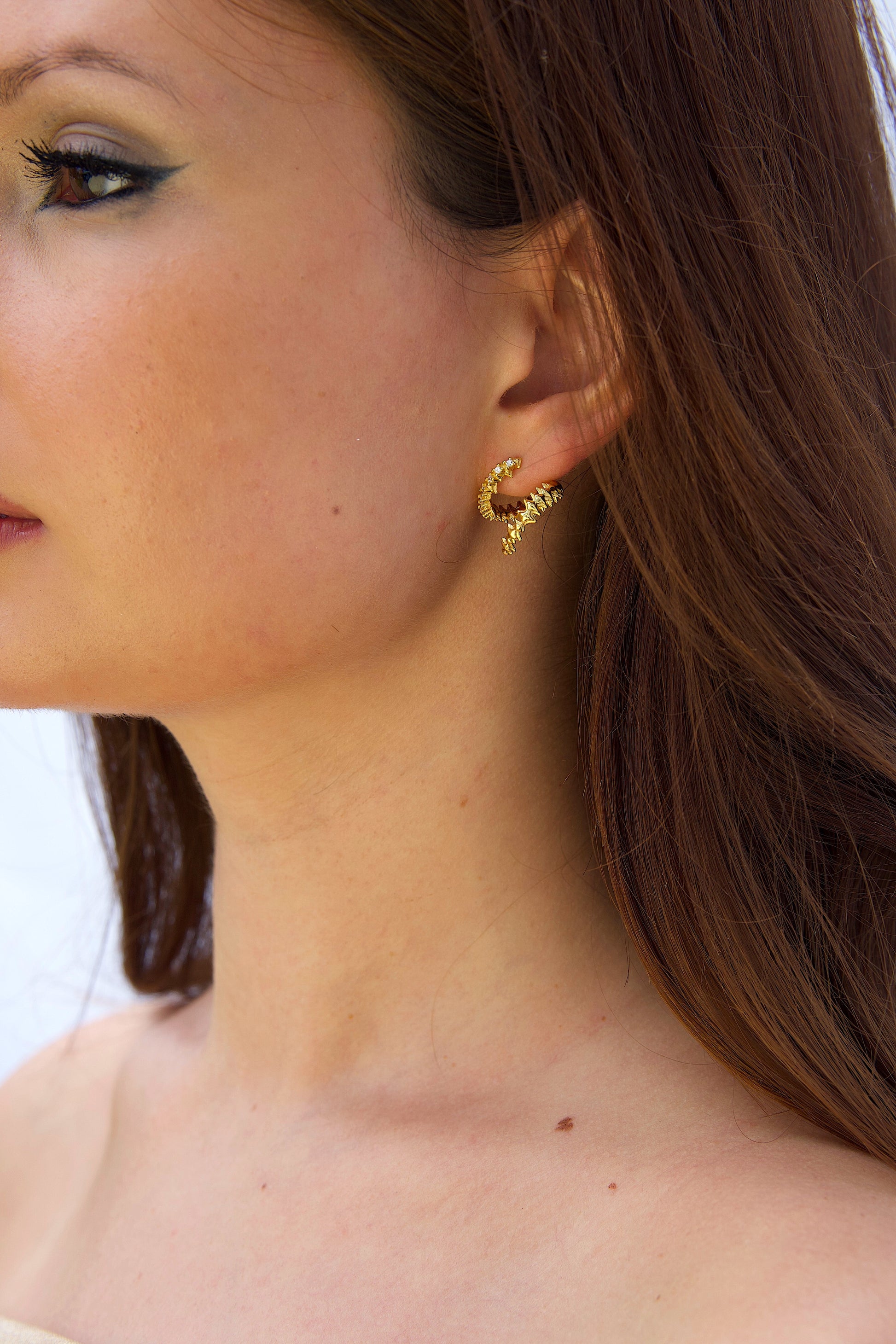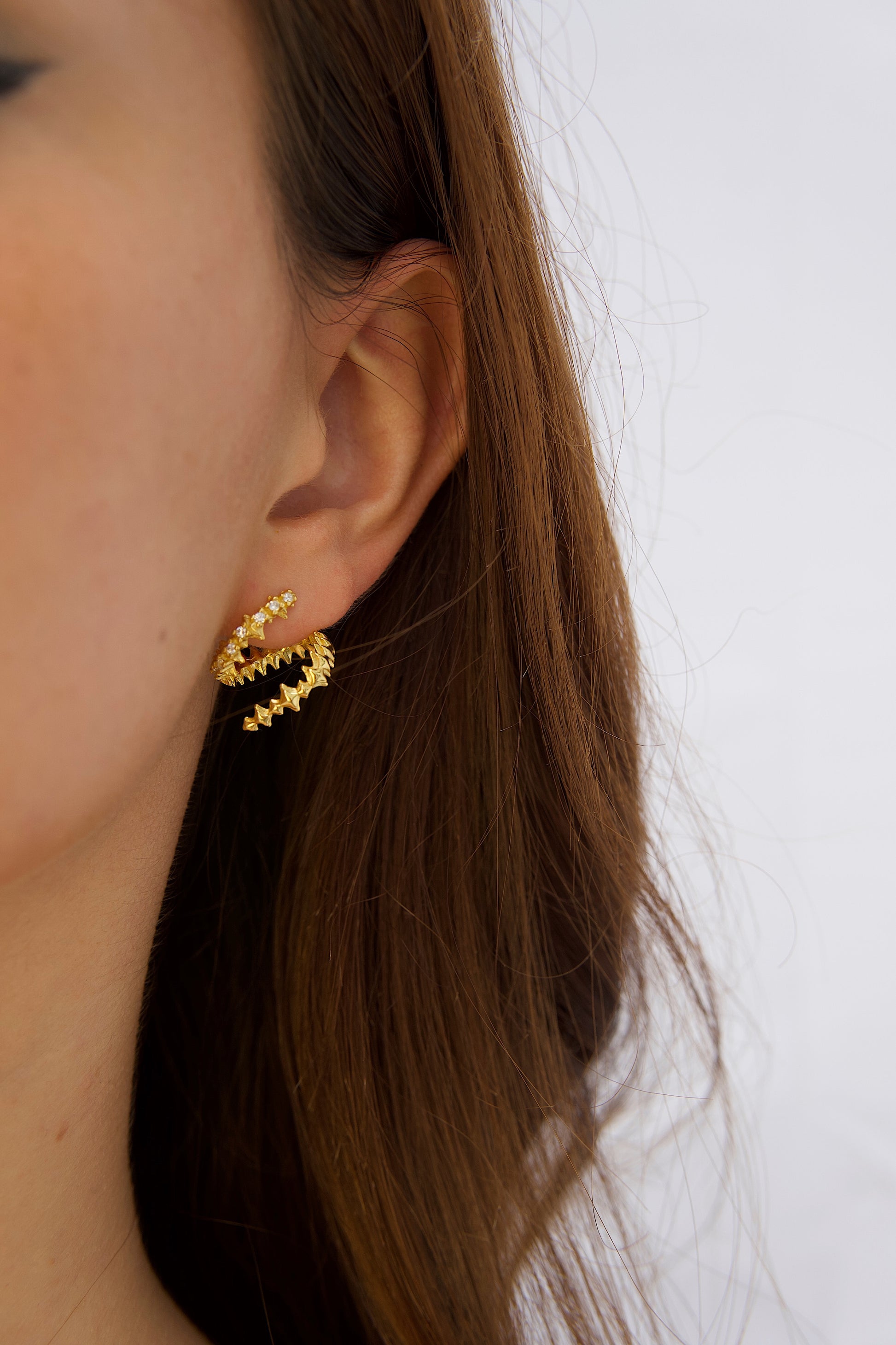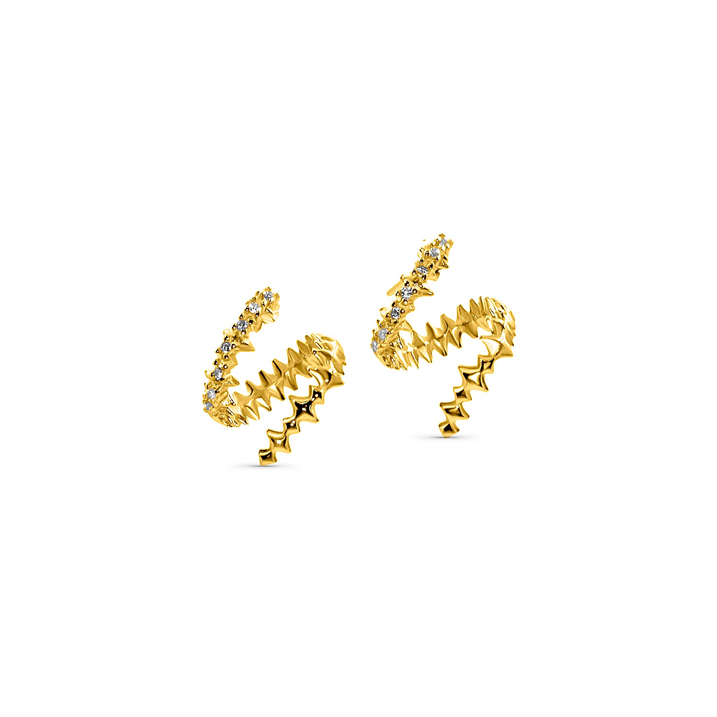 Deze elegante oorknopjes zijn geïnspireerd op de vorm van een slang en gemaakt van het fijnste goud. Ze lopen spiraalvormig omhoog langs het oor en zijn bezet met sprankelende heldere kristallen, waardoor elke look een vleugje glamour krijgt. Het slangachtige patroon van deze oorbellen geeft ze een exotische en dynamische uitstraling, ideaal voor modebewuste mensen die een verhaal willen vertellen met hun sieraden. Door het lichte en comfortabele ontwerp zijn ze ideaal om de hele dag te dragen of als opvallend accessoire voor avondgelegenheden.