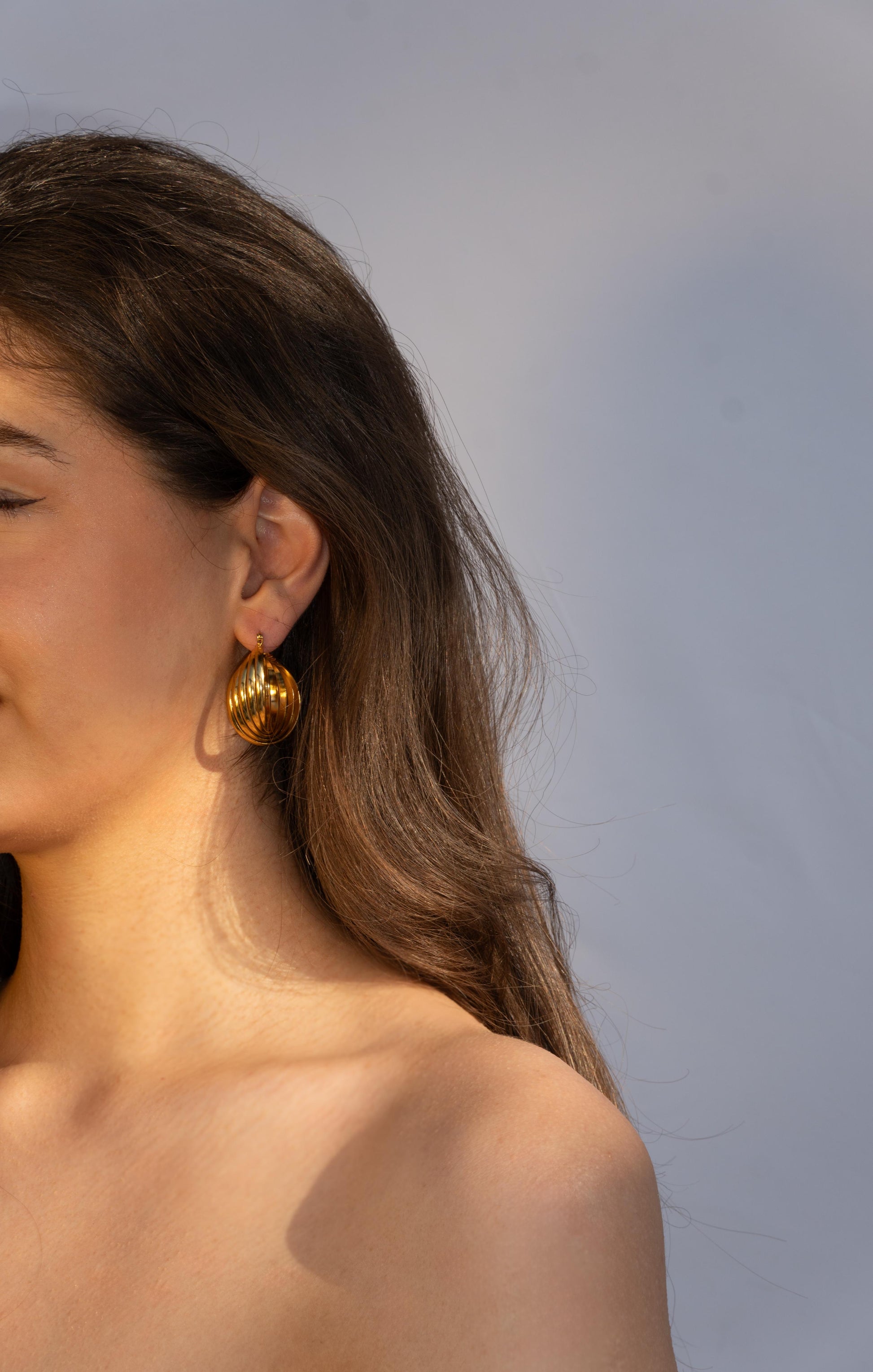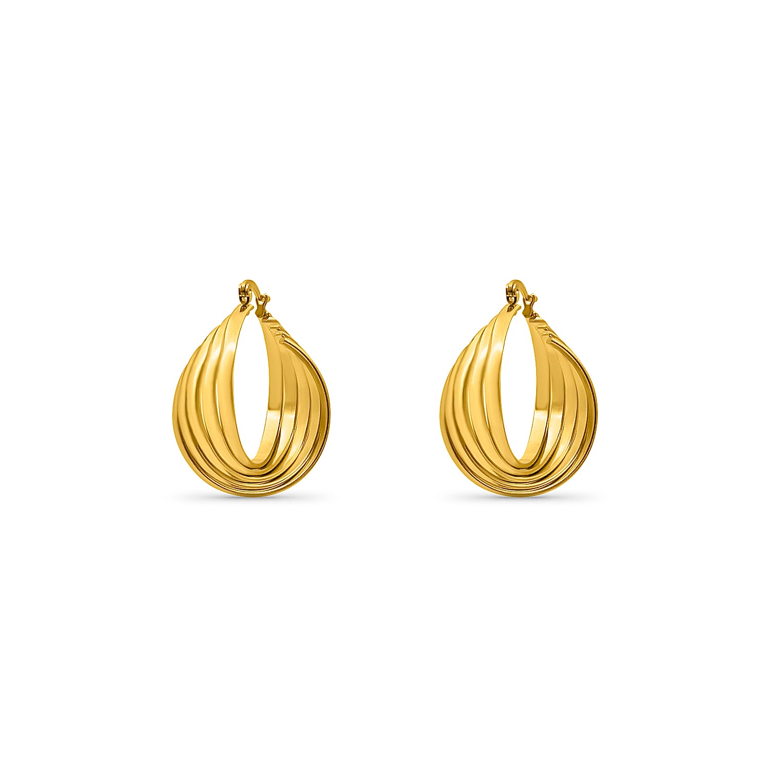 Diese Ohrringe sind ein ausdrucksstarkes und stilvolles Accessoire, das durch sein wellenförmiges Design besticht. Diese Creolen bestehen aus mehreren geschwungenen, goldfarbenen Strängen, die zusammen eine elegante und dynamische Form bilden. Das glänzende Finish verleiht den Ohrringen einen strahlenden Glanz, der perfekt zu festlichen Anlässen und eleganten Outfits passt. Trotz ihrer auffälligen Optik sind die Ohrringe leicht und angenehm zu tragen. Mit ihrem einzigartigen Design und der hochwertigen Verarbeitung sind die Ohrringe ein besonderes Schmuckstück, das jedem Look eine besondere Note verleiht.