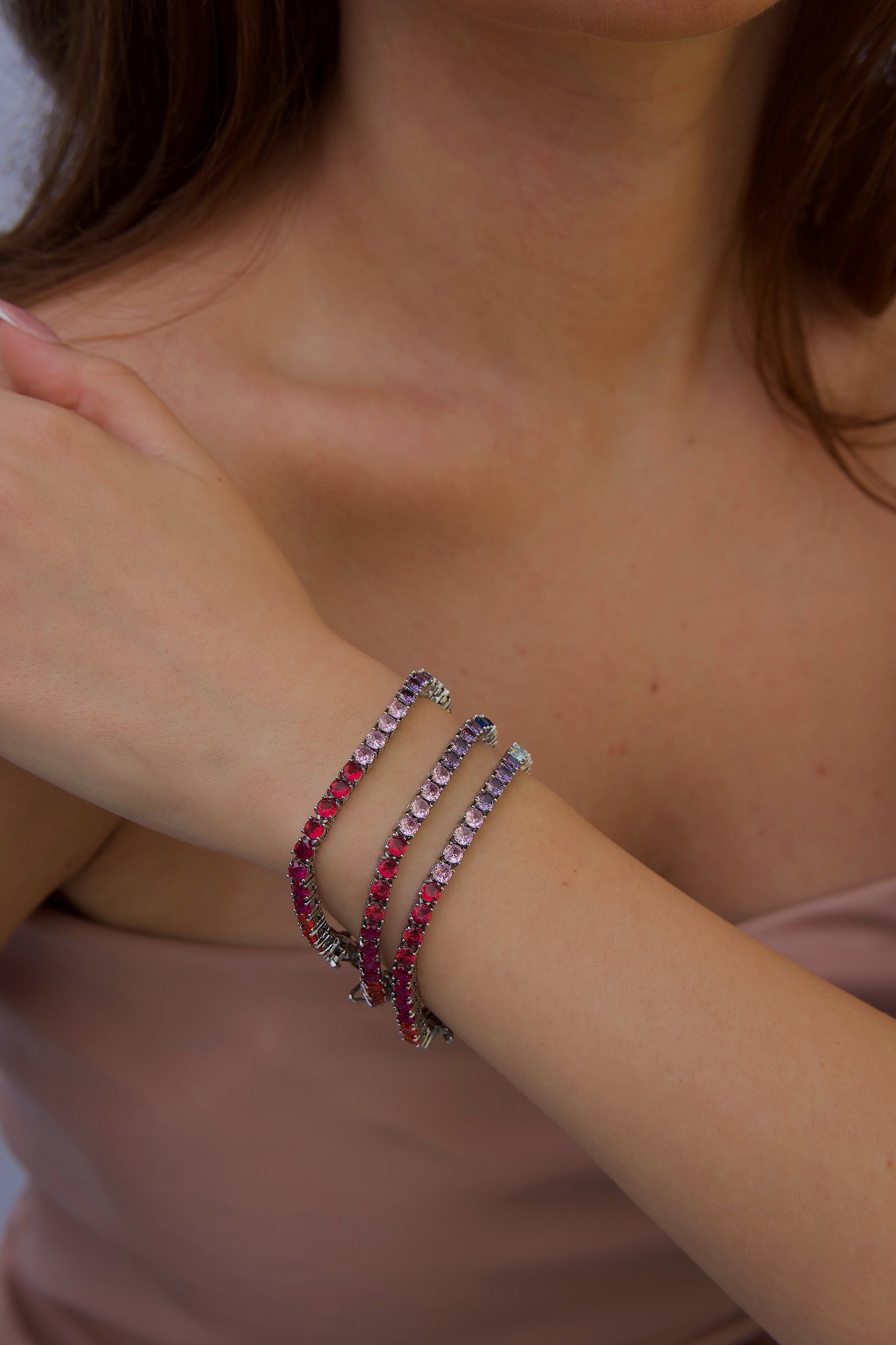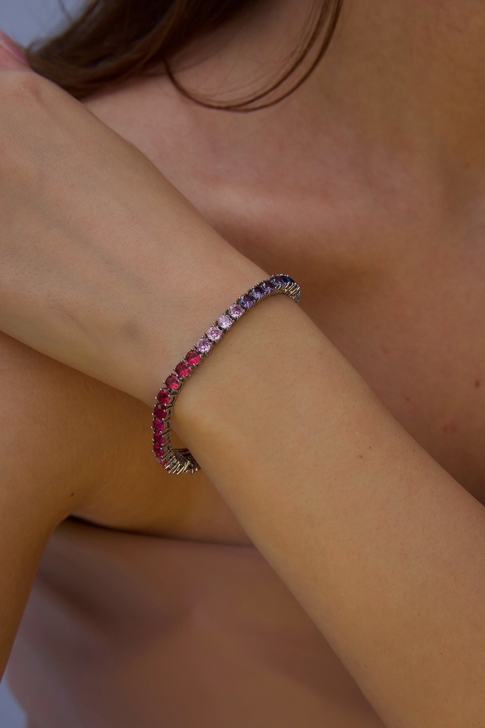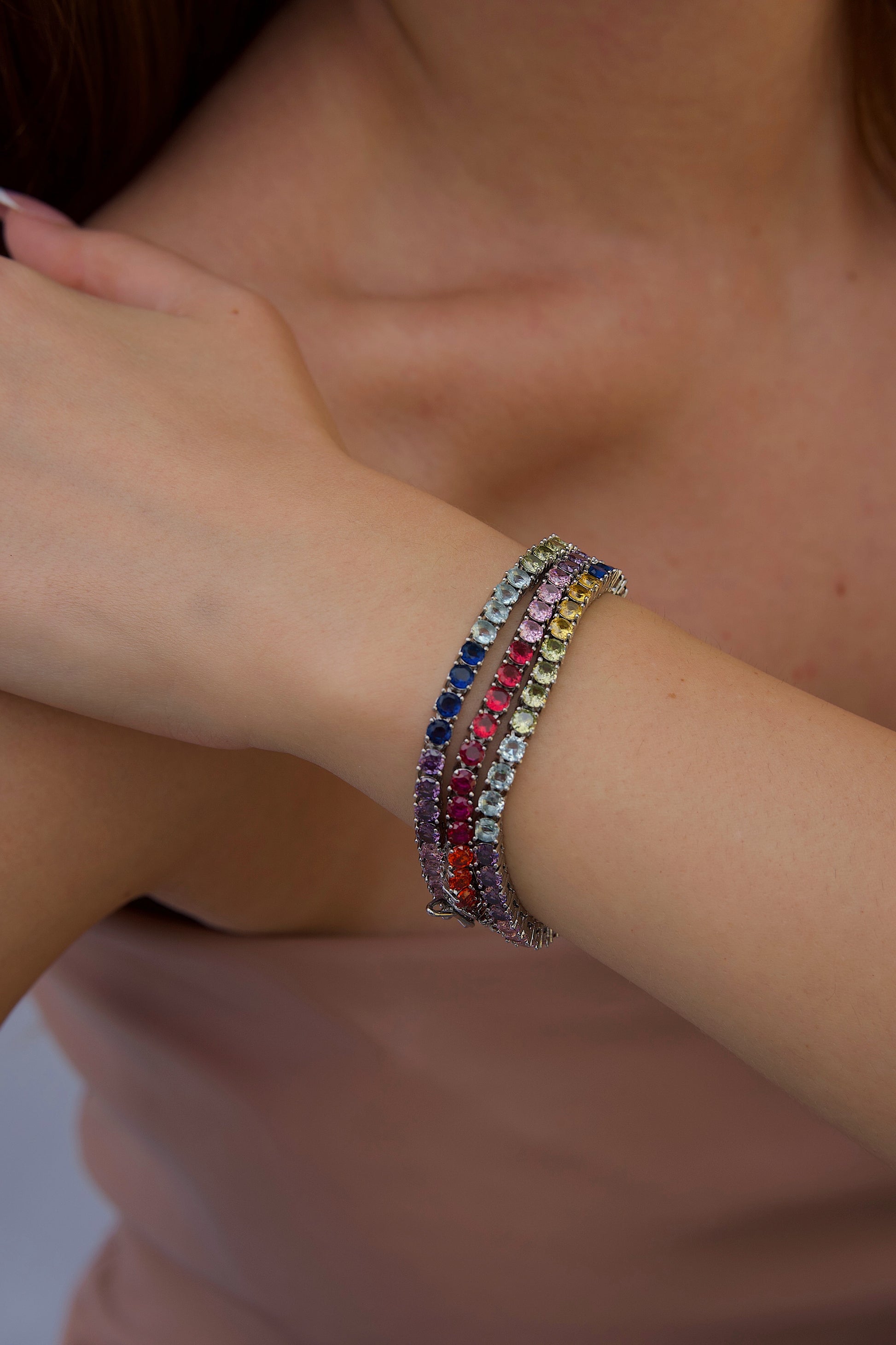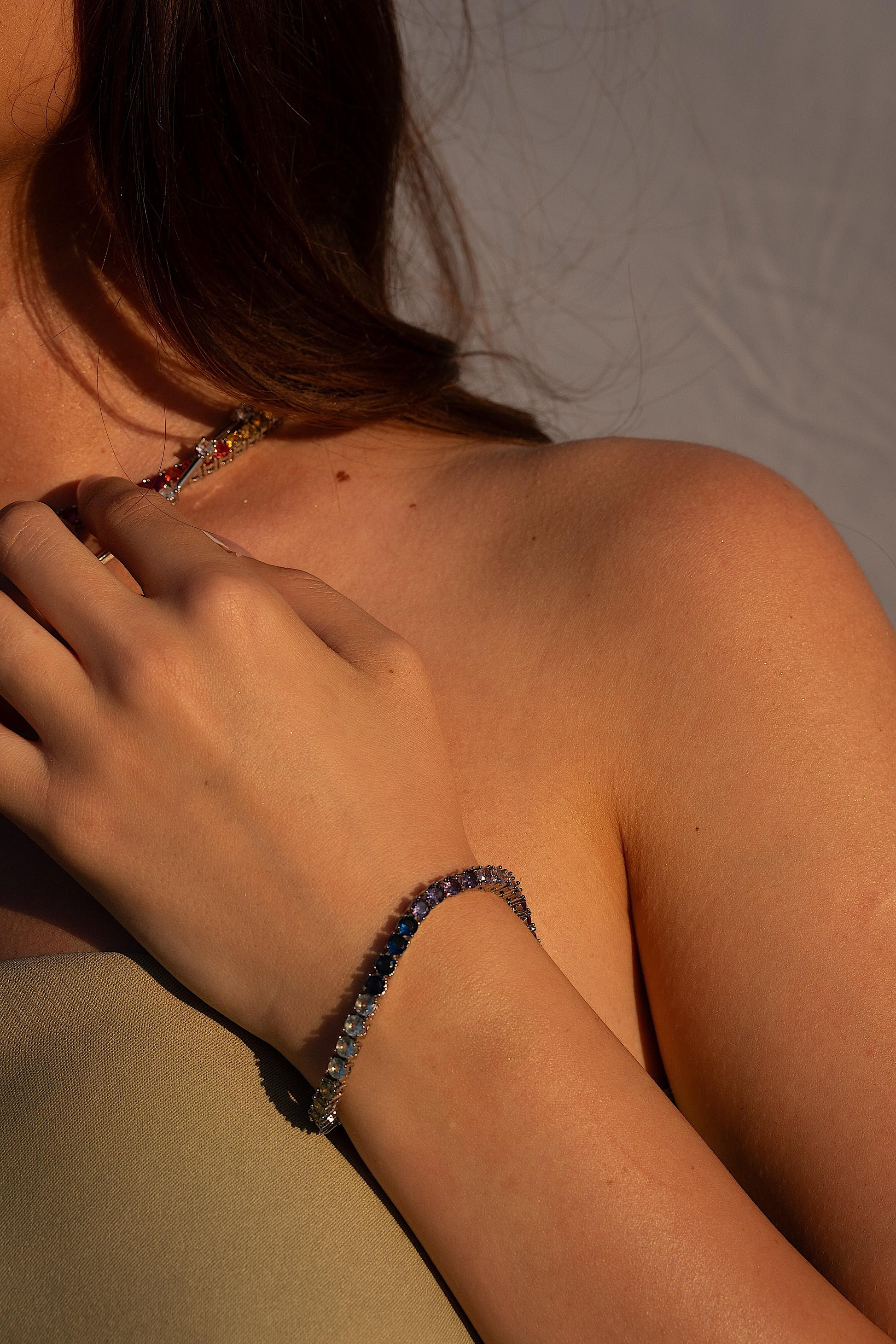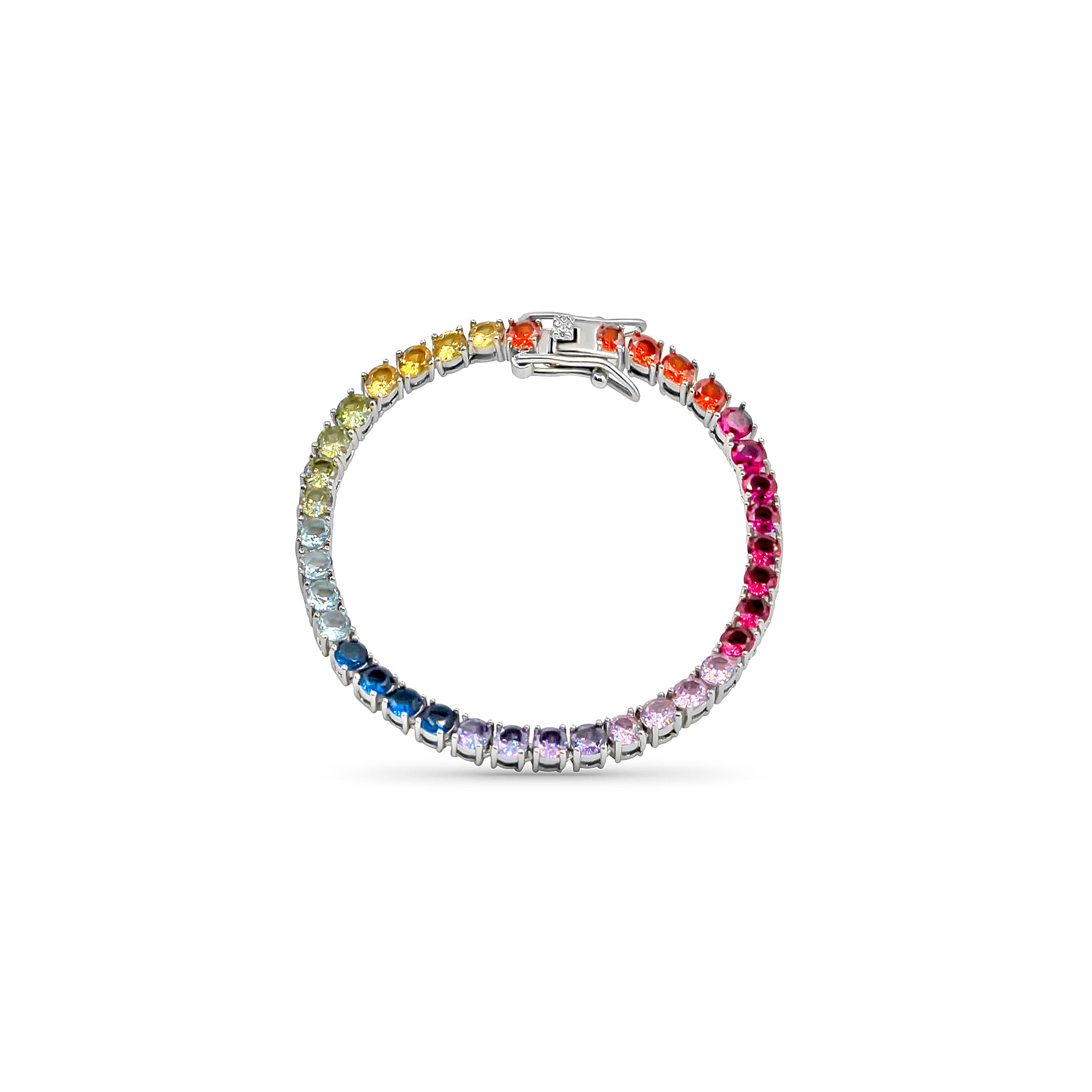 Dieses atemberaubende Armband besticht durch sein lebendiges und elegantes Design. Das glänzende Silberband ist mit einer beeindruckenden Reihe von funkelnden Edelsteinen in den Farben des Regenbogens besetzt. Die harmonische Anordnung der Steine, die von leuchtendem Blau über strahlendes Gelb bis hin zu kräftigem Rot reichen, erzeugt ein faszinierendes Farbenspiel, das bei jeder Bewegung funkelt. Jeder Stein wurde sorgfältig ausgewählt und präzise gefasst, um maximale Brillanz und Farbintensität zu gewährleisten. Der sichere Verschluss fügt sich nahtlos in das Design ein und sorgt für einen komfortablen Sitz. Tragen Sie dieses Armband, um Ihrem Outfit eine besondere Note von Fröhlichkeit und Eleganz zu verleihen und Ihre stilvolle Persönlichkeit zu unterstreichen.
