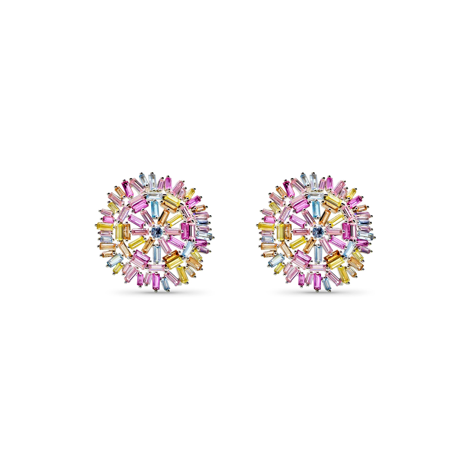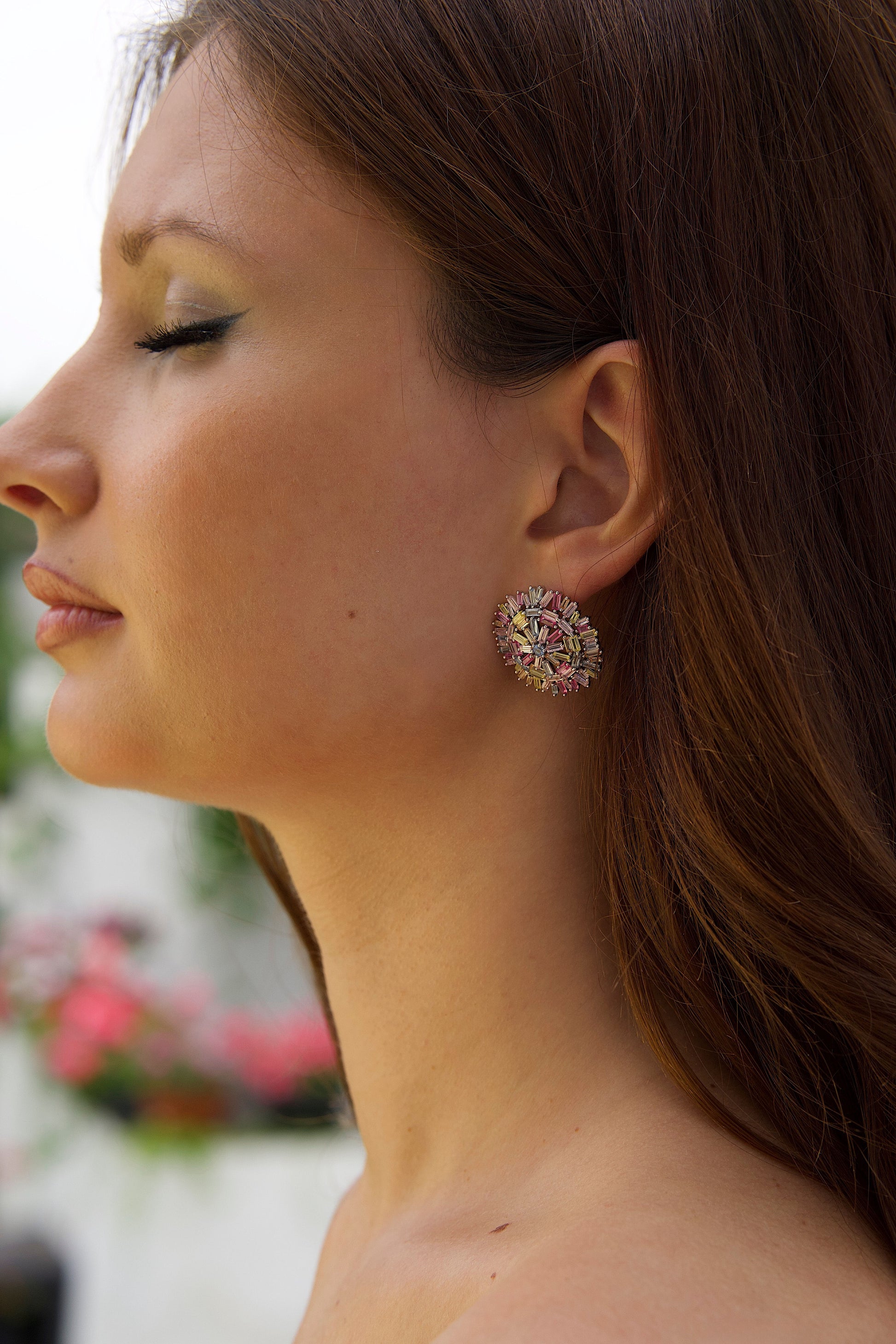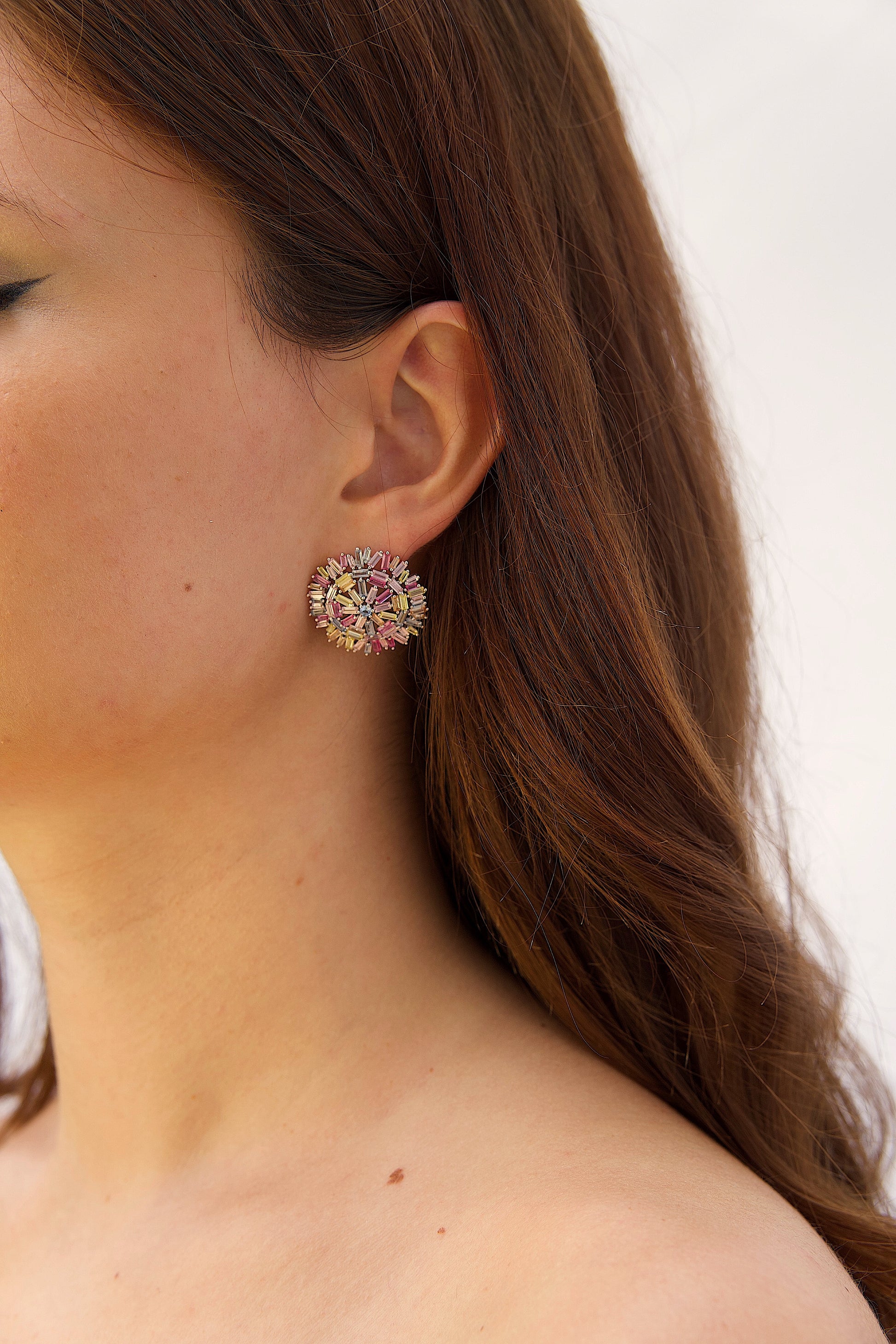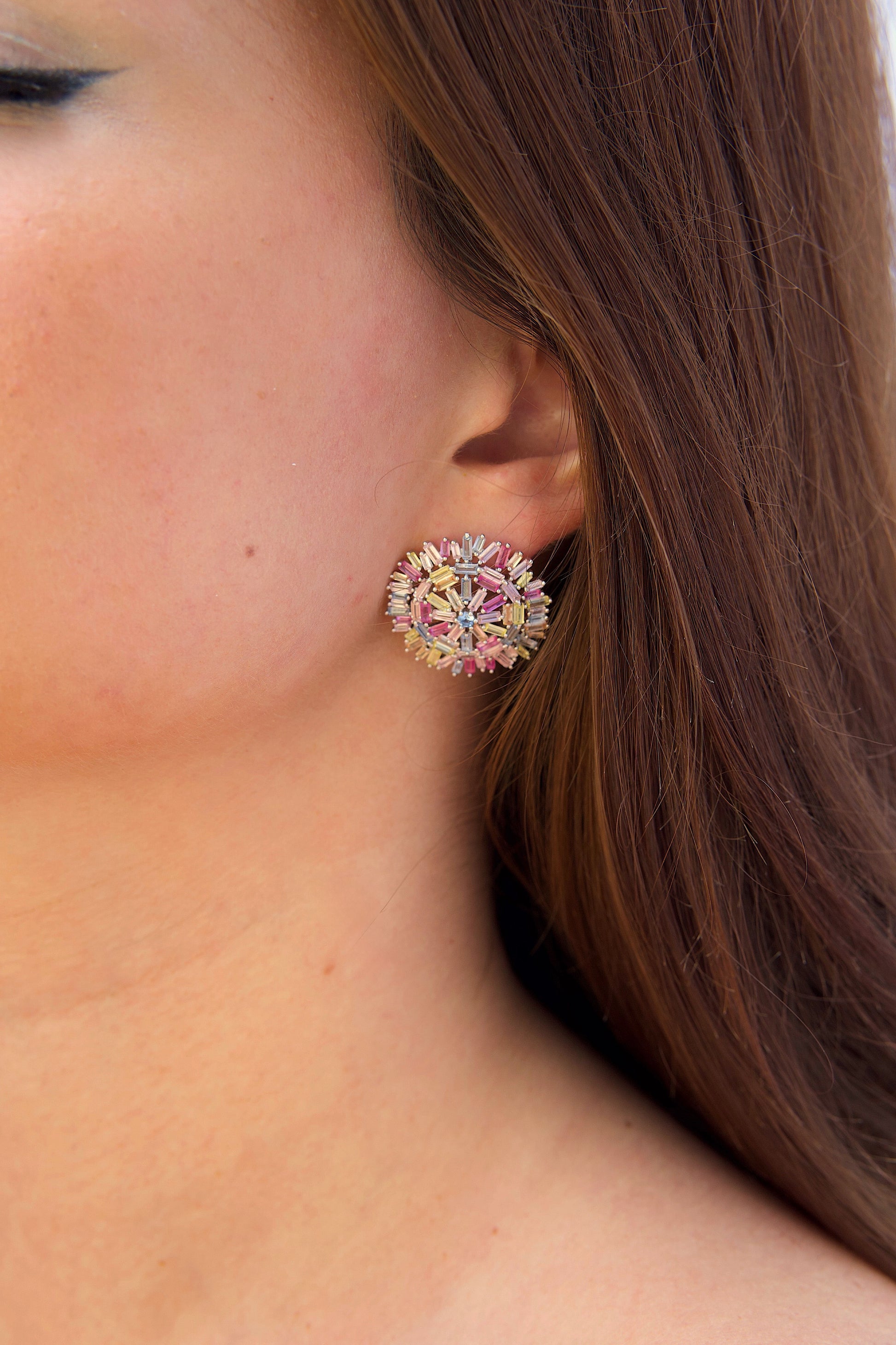 Diese bezaubernden Ohrringe faszinieren durch ihr kunstvolles und detailreiches Design. Die runden Ohrringe sind mit einer Vielzahl funkelnder Edelsteine in zarten Pastellfarben besetzt, die in einem strahlenden Muster angeordnet sind. Die harmonische Kombination aus Rosa, Gelb, Blau und weiteren leuchtenden Tönen schafft ein elegantes und lebendiges Farbenspiel. Jeder Stein ist präzise im Baguetteschliff gefasst, um maximale Brillanz und Leuchtkraft zu gewährleisten. Tragen Sie diese Ohrringe, um Ihrem Look eine besondere Note von Glamour und Individualität zu verleihen und Ihre stilvolle Persönlichkeit zu unterstreichen.
